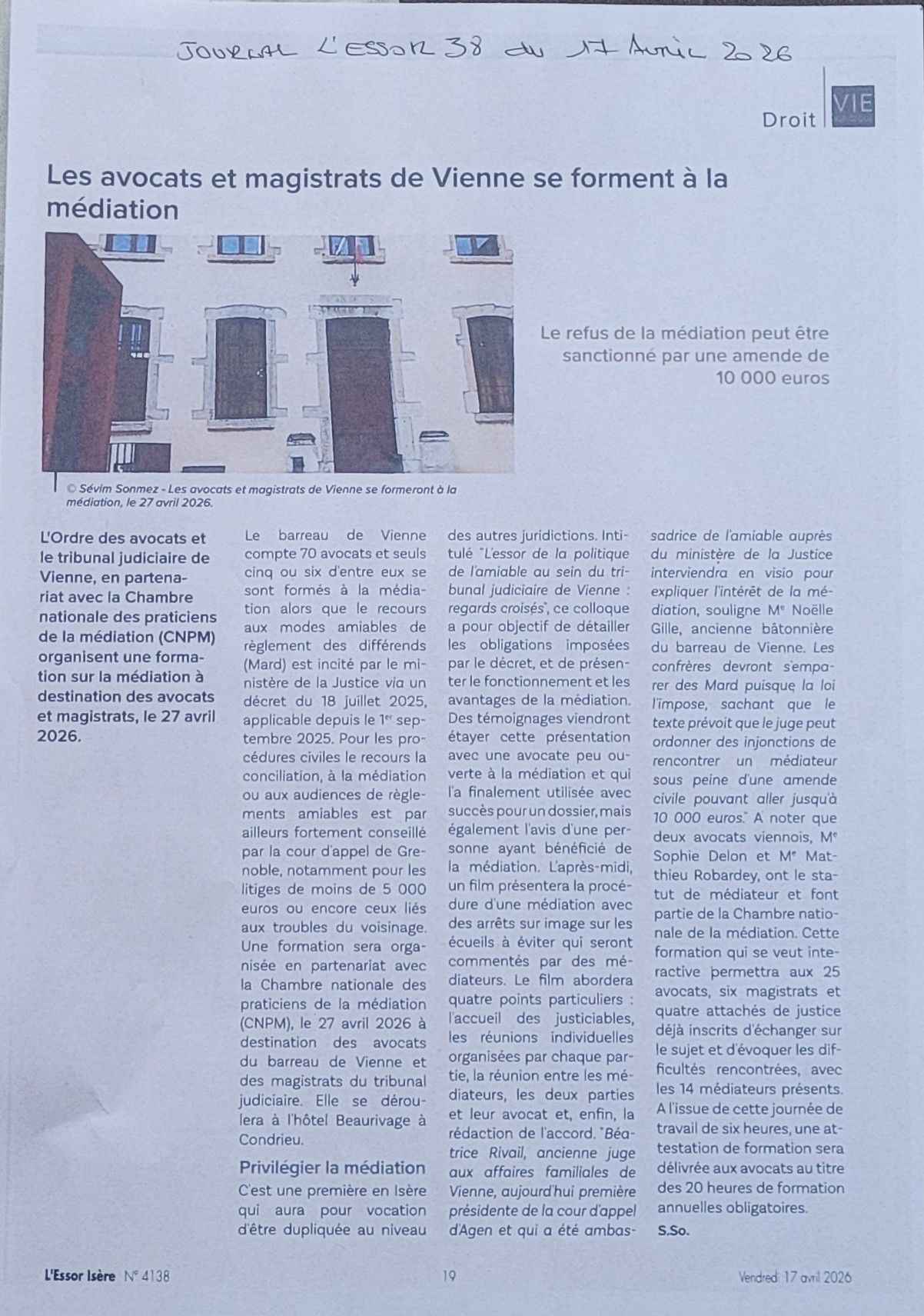 Le journal l'ESSOR de L'Isère valorise dans son édition du 17 avril 2026, le partenariat opérationnel entre la CNPM, le Barreau et les Magistrats du TJ de VIENNE (38), pour concevoir et réaliser un colloque dédié à la formation à la médiation, depuis les adaptations mises en place par le décret du 18 juillet 2025. Cette formation s'est tenue le 27 avril 2026 à l'Hôtel BEAU RIVAGE à CONDRIEU (69). Elle regroupait une cinquantaine de participants.